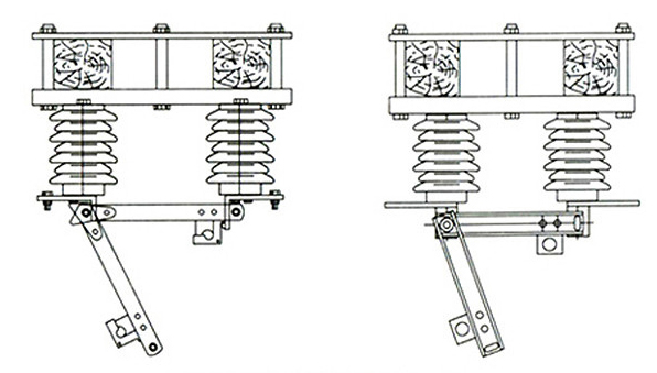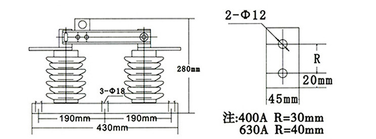 開關的額定電流有200、400、630、 800、1000安, 它們皆由底座、支柱絕緣子、導電部分和機構部分組成。采用閘刀式結構分合閘達到切斷和閉合線路。每相閘刀由兩片導電刀片組成,刀片兩側裝有壓縮彈簧,調節彈簧的高度可以得到開關閘刀所需要的接觸壓力。開關分合閘時用鉤棒操作機構部分便可以進行合閘運動。閘刀有自鎖裝置。開關的外型見圖所示。